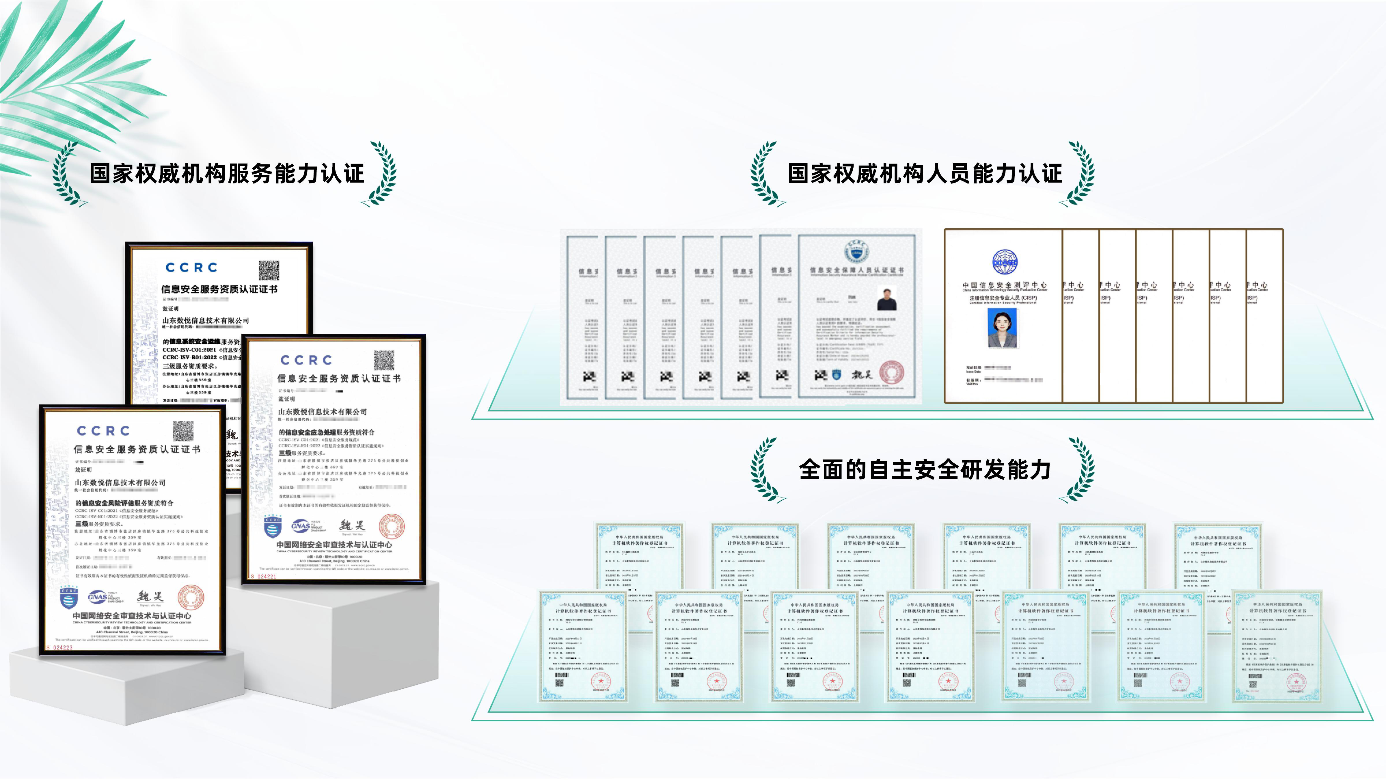 公司具有国家权威机构认证的多项安全服务能力资质证书,工程师均通过了专业考核认证,服务专业可靠用户更安心。